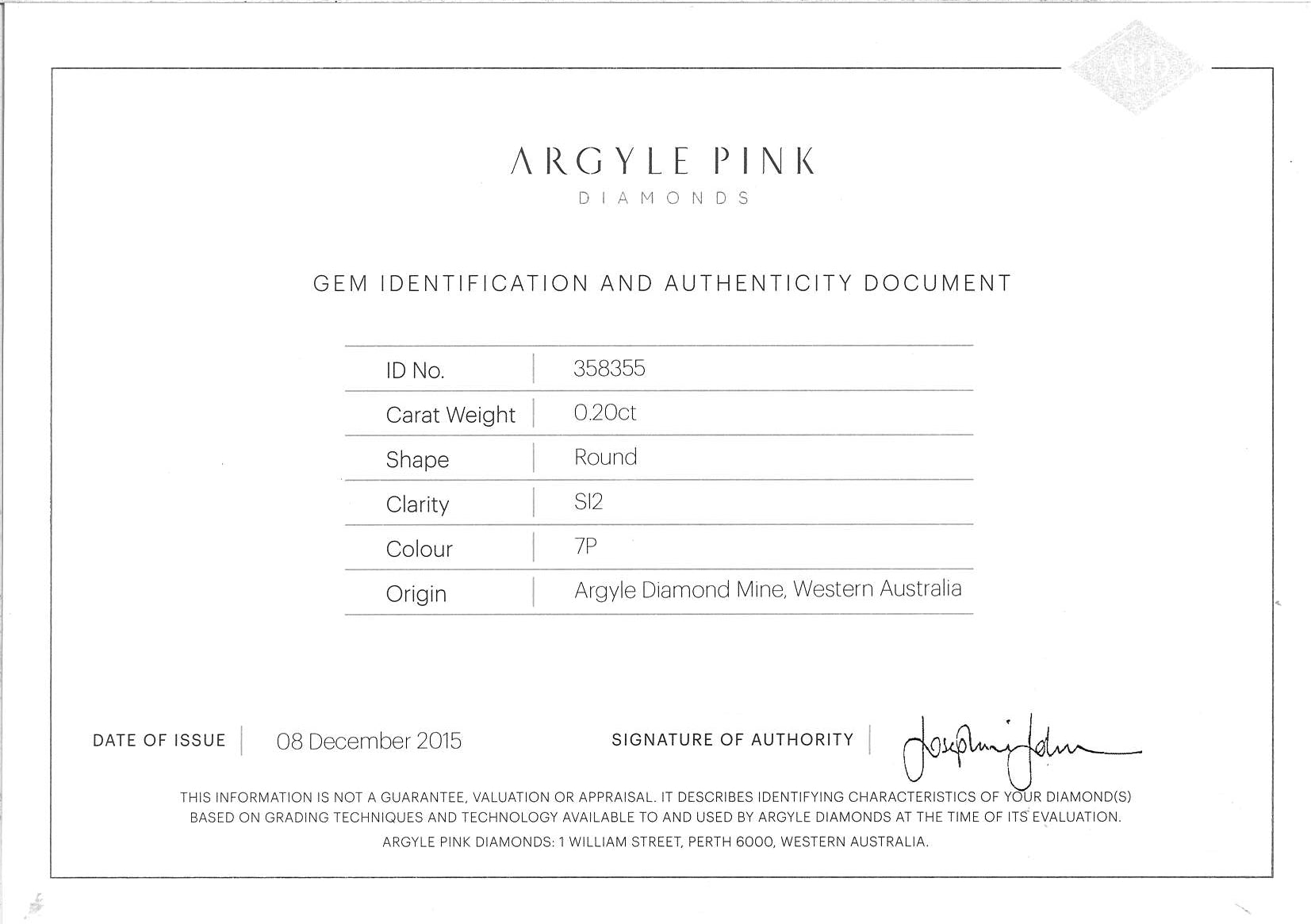 This 0.20ct round Argyle pink diamond features a stunning 7P colour and SI2 clarity, with precise measurements of 3.68 x 3.65 x 2.35mm. Certified by Argyle (Cert #358355), it represents a rare opportunity to own a piece of one of the world's most coveted gemstones. An investable treasure, its vibrant hue and exclusivity make it a timeless asset.